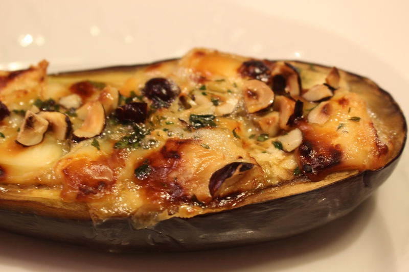 Finir de couper les moitiés d'aubergines. Assaisonner légèrement et déposer des rondelles de fromage sur les moitiés d'aubergines.
