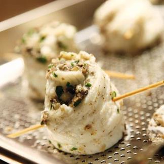 Farcir les filets de sole avec la duxelle et les rouler, les maintenir avec un pique en bois.