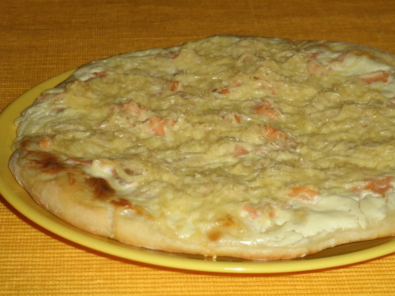 Étaler la pâte à pizza sur une plaque à pizza (ou une plaque à pâtisserie), disposer dessus une couche de crème épaisse, puis mettre des morceaux de saumon fumé et recouvrir de fromage râpé.