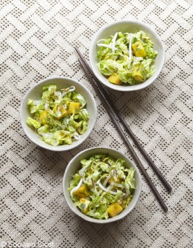 1. Rincez les sucrines, épongez-les et coupez-les en fines tranches. Pelez la mangue et coupez-la en cubes. Mélangez sucrine, mangue et pousses de soja.